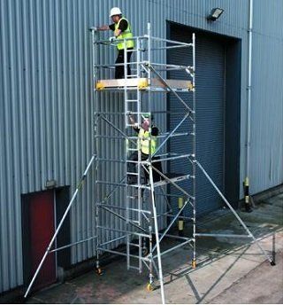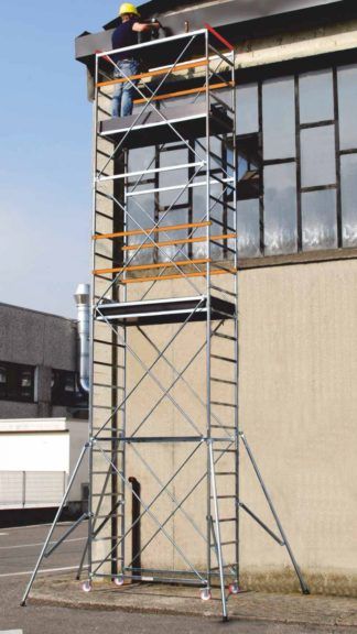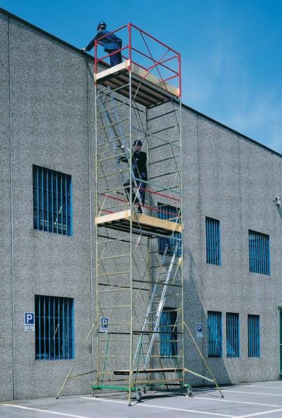 Dispone di una grande base rettangolare rigida che consente l’applicazione di stabilizzatori a vite (optional) ed una ampia superficie di calpestio per ogni piano lavoro, garantendo comodità nei movimenti in quota. Con la sola aggiunta di piani di lavoro e parapetti intermedi si conforma alla norma Europea UNI EN 1004 per un uso non ancorato.